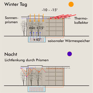 Ziel ist es, einen Innenraum im Außenraum zu schaffen, der über den Jahreslauf witterungsunabhängig am Tag und am Abend Aktivität und Leben auf den Marktplatz bringt. Durch intelligente Ausgestaltung der Gebäudehülle wird eine energieaufwendige Kühlung und Beheizung vermieden und das Raumklima witterungsabhängig gesteuert. Licht- und Sonneneinfall werden durch Prismen geregelt, Thermokollektoren speisen Solarenergie in einen Saisonalspeicher unter der Halle, der ergänzend zur Solargewinnung der Temperierung im Winter dient. Im Sommer kann der Raum durch ein Schiebedach und großflächige Öffnungen auf der Nordfassade zum Platz hin geöffnet und belüftet werden. Zur Geschäftszeit erfolgt eine Verknüpfung beider Nutzungsbereiche mit entsprechenden Synergien. Nach Geschäftsschluss bleibt die Halle autark nutzbar.